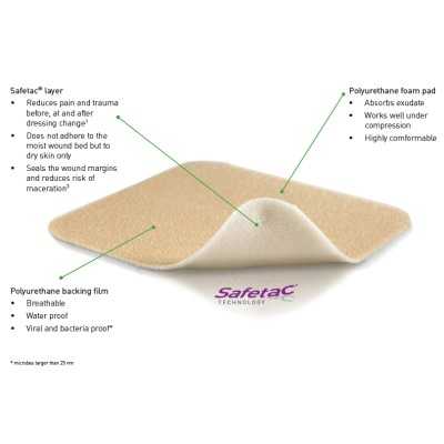 Cuenta con tecnología SAFETAC, es la capa de silicona de contacto con la piel que evita cualquier adherencia del apósito a la piel y esto disminuye considerablemente el dolor a la retirada y durante la curación, también al no adherirse evita perder la piel ganada en la cicatrización o lastimar la piel sana de los bordes.